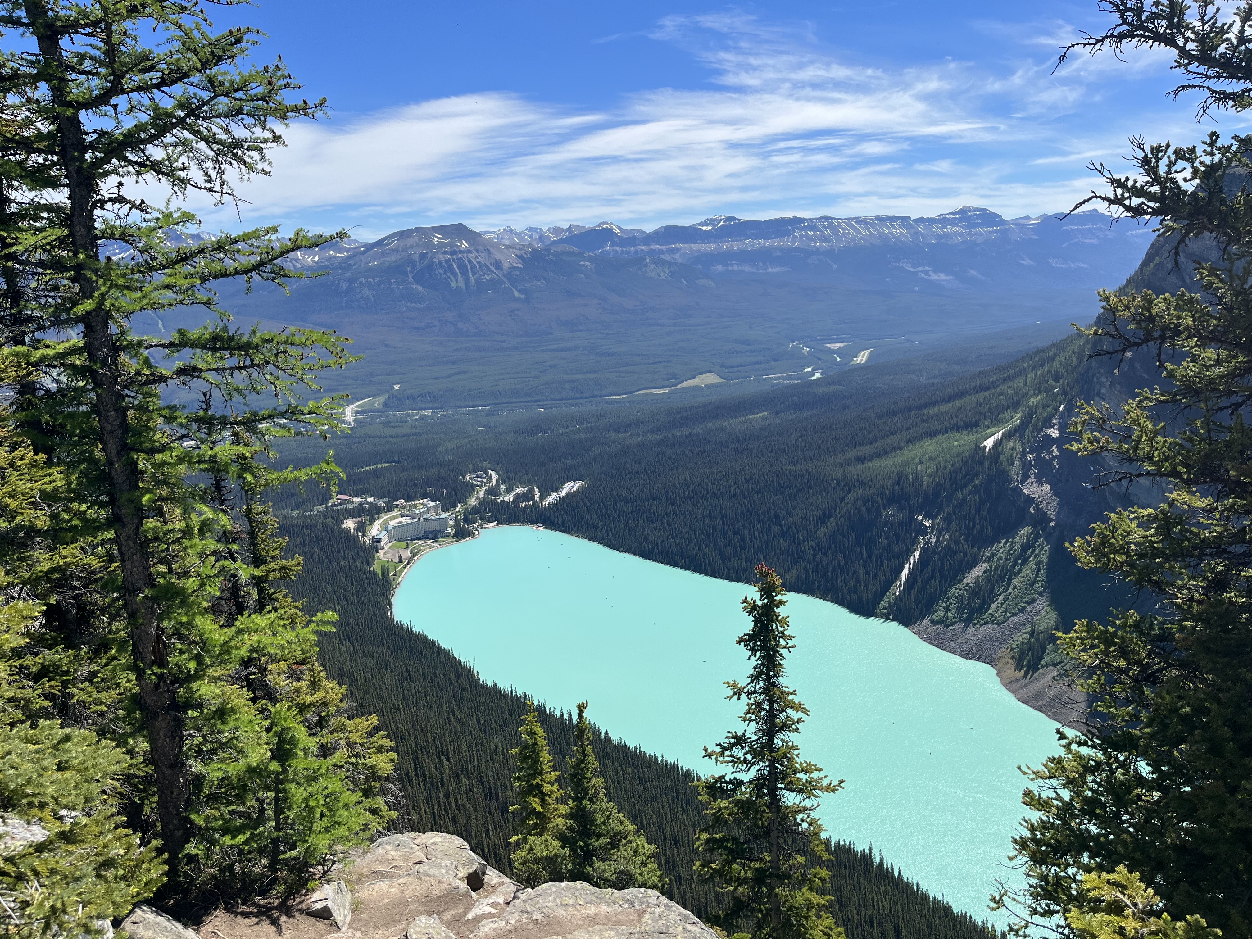 This next day was my favorite hike for a lot of reasons. If I'm being perfectly honest---It didn't start that way as we had to wake up at 4:30am in order to attempt to get a parking spot and the lot we were trying to get into was already full by 3am!! What kind of crazy hikers are getting there by 3am!? Anyway, it worked out fine because we parked in a different lot with availability and did a different hike. Luckily our truck has a bed in it, so we slept for a few more hours in the parking lot. Lake Louise was magical as well and had that same signature aqua blue color. Our hike started by walking around Lake Louise and heading to Lake Agnes, which was special to me because this is my great-grandmother's name. It was a steep incline until we got there with relentless switchbacks through the woods. Lake Agnes was nestled into the face of several mountains and had a teahouse where you could grab a snack and some tea on your hike. There was actually another teahouse on this hike, so we waited to grab something tasty at that one. From Lake Agnes, we headed up a trail called Big Beehive that was again steep with neverending switchbacks, but this time we were treated to views of both Lake Louise and Lake Agnes from the top. Simply beautiful, the kind of view that you could stare at for hours and not even realize the time passed by. We had a nice snack here and then headed on to the Plain of Six Glaciers trail. The teahouse was just the coolest! It was tucked into a valley, next to a stream of glacier water, and surrounded by mountains. The sweetest waitstaff served us a cool glass of lemonade and homemade biscuits with strawberry jam (YUM!). The perfect snack after a long hike. After this lovely stop, Matthew filled up his drinking water in the stream and had some fresh glacier water to drink for the rest of the hike. It didn't stay cool for long though, because it was toasty in the sun on the exposed trail we took to check out several glaciers in the distance. This peak was enclosed by five mountains, each with its own glacier (and one with two).